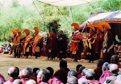 经过几场轻松活泼的表演之后,器乐的情绪为之一变,舞台气氛立刻显得格外凝重起来。16位密法咒师,以庄严缓慢的舞步徐徐进入中场。他们头戴黑色园帽,帽檐下眼神森森;身穿宽大的黑袍,前胸后背也有许多眼睛。一支致敬队奏着热烈的乐曲,绕场半周来到咒师们面前,敬献掺有五种金银粉末的金酒,向天空和大地抛洒祭祀本尊护法诸神,召请他们降临神舞场。相传16位咒师,是怖畏金刚16条腿的化身,因此具有召请雪域诸神的魔力。