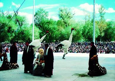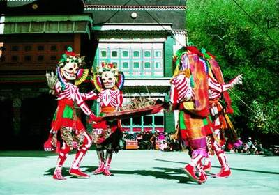 接着是4个全身骷髅白骨的鬼物,以极快的速度回旋舞蹈而出,舞过通道,舞下台阶,在观众面前任意翩跹,随心蹦跳,呼啸奔跑,精彩异常,又略带一些恐怖。这些角色称为“多达”,译成汉语为“陀林尸主”,他们是天葬场的精灵,天葬一万具尸体才出现一个。别看模样可怕,心地是慈悲的,他们是护法神的化身。