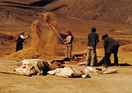 青稞的秸杆名叫“散巴”,质地柔软,是喂养牲畜的好饲料。青稞的播种时间,在西藏的山南贡嘎县姐德秀镇克西村一带是藏历三月五日始,断断续续地一直到月底。播种前的准备,头年秋收后,灌一次水,待稍干后,将地犁一遍,临近冬天时再灌一次水,用一种叫“夏拉”的耙子耙一遍。“夏拉”是方木板钉的长方形木架,其上有两排木齿,齿长四寸。耙地时用马或牦牛为畜力,人站其上。进入冬天后再灌一次水,保墒。到了来年春天,约在藏历年前后,还得用一种叫“妥”的木榔头密密地打一遍。藏历年后上肥,肥是农家肥。克西村人的农家肥,主要是骡、马、驴、猪、狗和鸡的粪便,唯独缺了牛羊粪。牛粪,掺上草拍成饼状,贴在院墙上,晒干后贮藏起来作燃料。牛粪饼晒得多,象征着家里牛多、主人勤快,是会过日子的人家。晒干的牛粪饼,用于烧火做饭取暖。把羊粪晒干后弄成碎末,煨暗火,温酥油茶。将牛羊粪灰倒入厕所垫圈,积肥。运肥料时,将肥料装到牛毛袋子里,用毛驴驮到地里,分成堆,用土盖住,便做好了春耕准备。