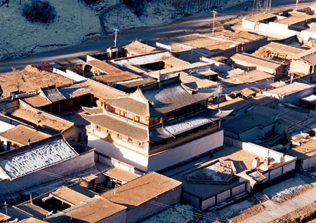 佑宁寺距离西宁只有60公里左右,或从互助走,或从平安驿走,都很方便。离开平安驿湟水河边的玛藏岩寺,沿着寺边的红崖子沟北上26公里,在一个叫“五十乡”的地方,沿着巴洪岔路北上6公里,可以看见布满松柏的群峰中,有一座突兀的山岩,山谷中有一片村庄般的寺院,也许应当说是寺院般的村庄;寺滩村,这就是佑宁寺。村庄很破落,寺院很萧条,山下仅仅有两三座开始修复的殿堂,山坡上,有许多院落,但光鲜的寥寥无几。但佑宁寺无论是在藏传佛教史上,还是在青海历史中,都占有着非常重要的地位。