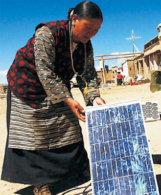 西藏普兰县霍尔乡牧民在调试太阳能发电硅光板.1991年以来,国家在阿里地区相继实施“阳光计划”“光明工程”等“阳光”工程,先后建成5千瓦以上的太阳能电站50多座;向农牧区推广太阳灶13200台;太阳能户用电源12000多套;全地区36个乡镇的机关、学校等单位都用上了太阳能光伏电站。