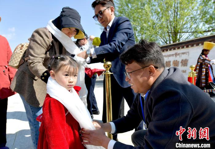 图为西藏非物质文化遗产博物馆工作人员为小观众献哈达。李林 摄