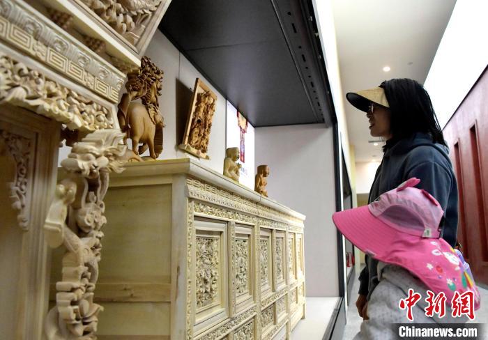 图为观众欣赏传统木雕。李林 摄