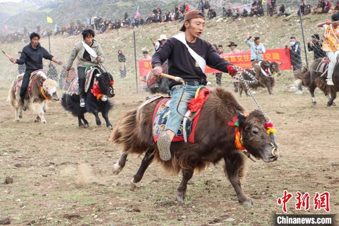 赛牦牛活动现场,牧民将自家的牦牛精心打扮,信心满满地走上起跑线,一声令响,众骑手驱牛疾驰。现场呼声阵阵,高潮迭起,为每一头疾驰的牦牛加油欢呼。