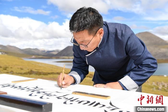 图为书法家在思金拉措湖边用藏文书写“思金拉措”。 贡嘎来松 摄