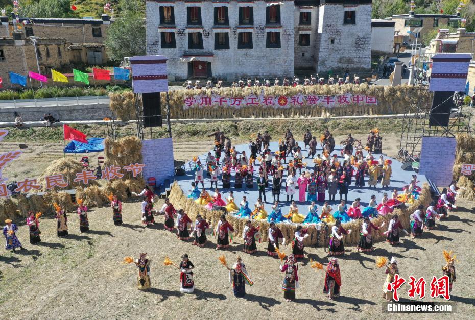 9月22日,2024年西藏“中国农民丰收节”庆祝活动在山南市琼结县拉玉乡强吉村举行。活动以“学用‘千万工程’礼赞丰收中国”为主题,由西藏各地(市)民间演出队为大家献上一场具有地域特色、体现农牧民丰收喜悦的歌舞盛宴。图为演出现场。(无人机照片)