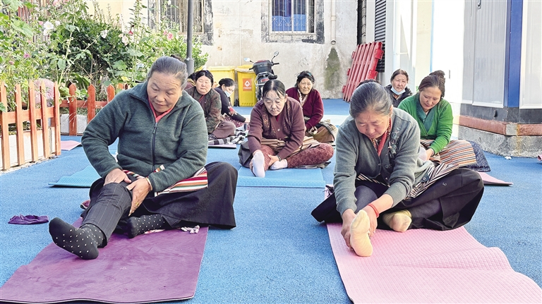 拉萨市城关区策门林老年日间照料中心的老人们正在练瑜伽。记者 央金卓玛 娄梦琳 摄