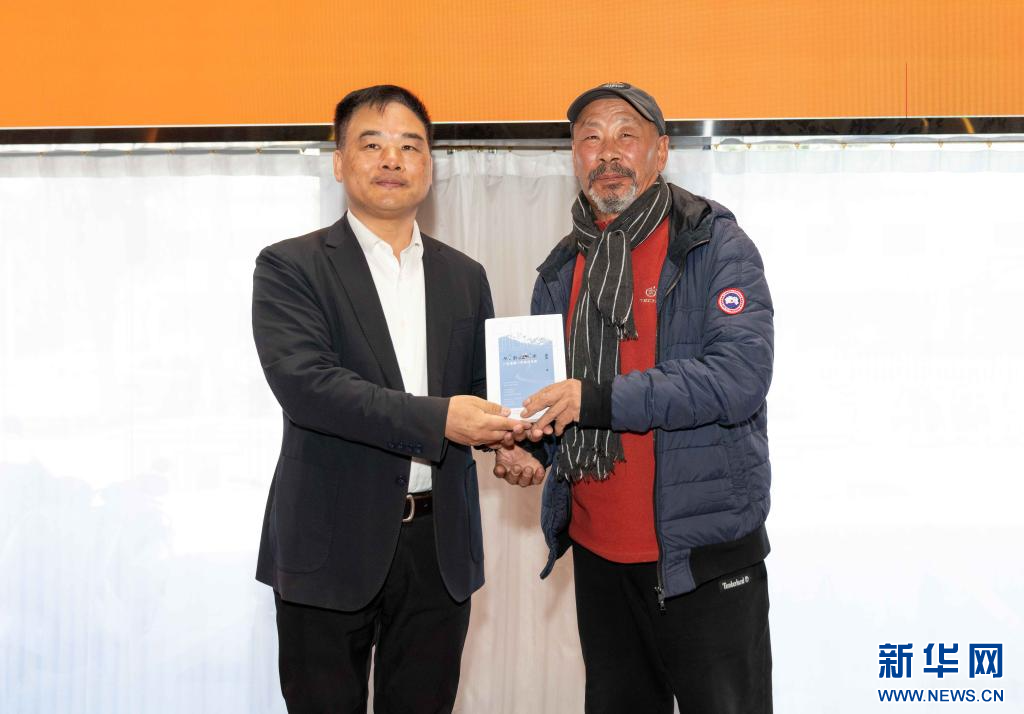 作者余风(左)向莅临的嘉宾赠书留念(11月9日)。新华社记者 旦增尼玛曲珠 摄