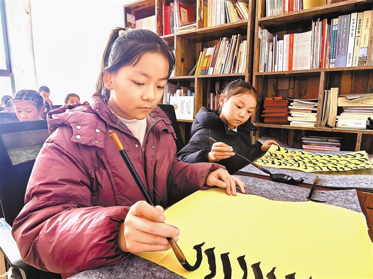 课堂上,驻村工作队员认真讲解书法的意义,介绍文房四宝使用方法,纠正握笔姿势,并示范书写技巧。