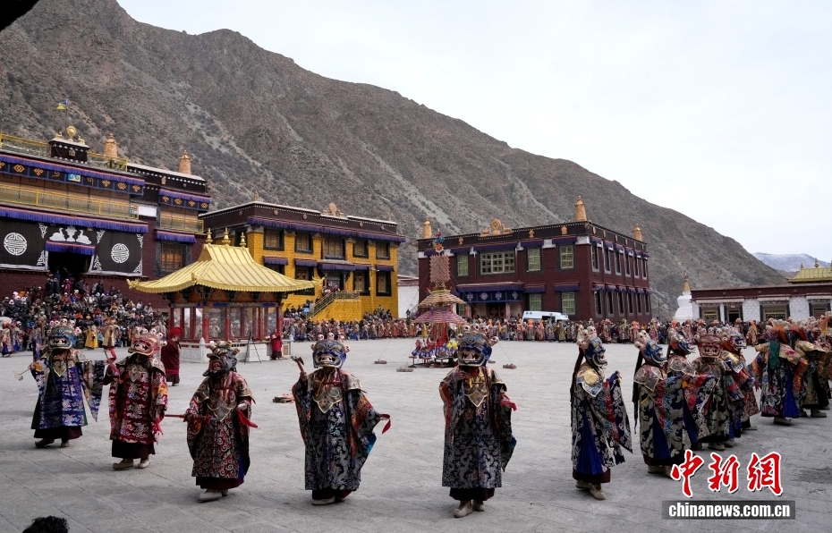 2025年2月27日是藏历十二月二十九,西藏拉萨楚布寺举行“羌姆”(跳神)活动,以驱邪送崇、祈福禳灾,同时表达对藏历木蛇新年的美好祈愿。跳神,是由藏传佛教僧侣表演的一种宗教舞蹈,有单人舞、双人舞和集体舞三种形式。图为楚布寺僧人们佩戴面具参加跳神活动。