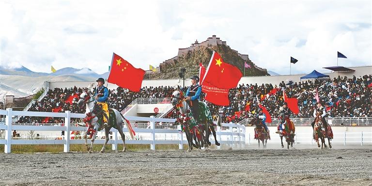 开幕式上,100匹骏马踏着鼓点奔腾而来。骑手们手持国旗,马鬃飞扬,金黄的青稞穗与洁白的哈达交织成画。紧随其后的方队演绎着传统与现代的对话,深情表达了江孜人民对党的无限感恩、对祖国的无限热爱、对西藏繁荣发展的美好祝愿。