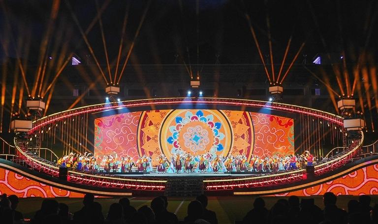 舞台设计同样暗藏巧思,主体采用巨型“同心圆”架构,设计中巧妙嵌入藏族传统建筑的经典纹样,同时将山南的人文风貌与山水景致融入其中,让地域特色与艺术美学自然交融。