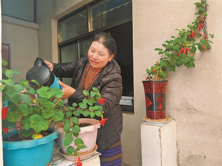 图为那曲市林廓社区居民斯曲在自家阳光房里整理花卉。记者 万靖 摄