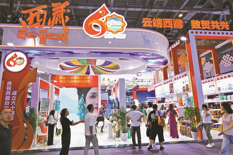 9月25日,第四届全球数字贸易博览会(以下简称“数贸会”)在杭州大会展中心启幕,丝路电商馆内的西藏展馆凭借鲜明的地域特色与发展亮点,吸引众多参会者驻足。入口显眼处高挂西藏自治区成立60周年庆祝活动徽标,既呼应重要历史节点,更彰显着高原大地以数字为翼、加快推进开放发展的坚定步伐。