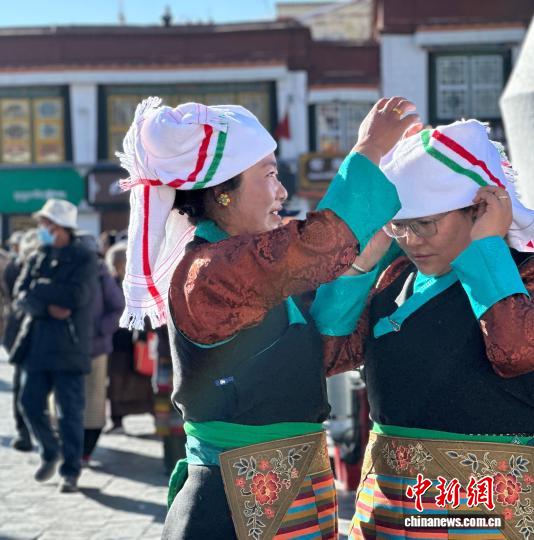 12月4日,拉萨大昭寺前信众整理着装拍照留念。谢牧 摄