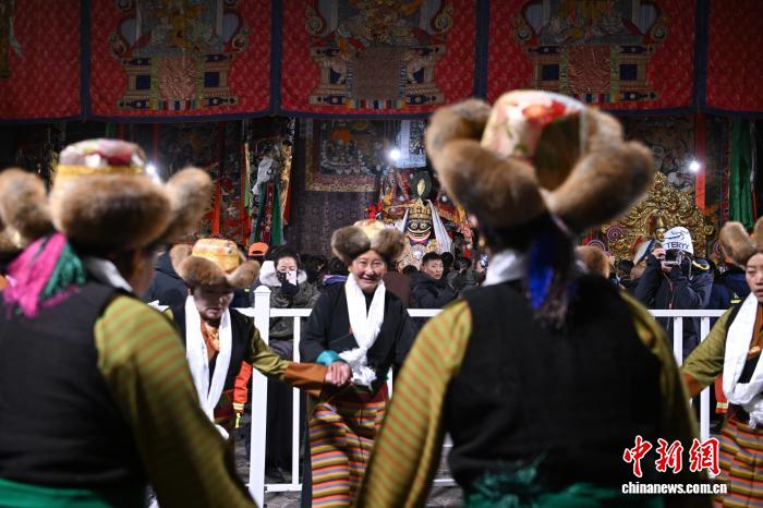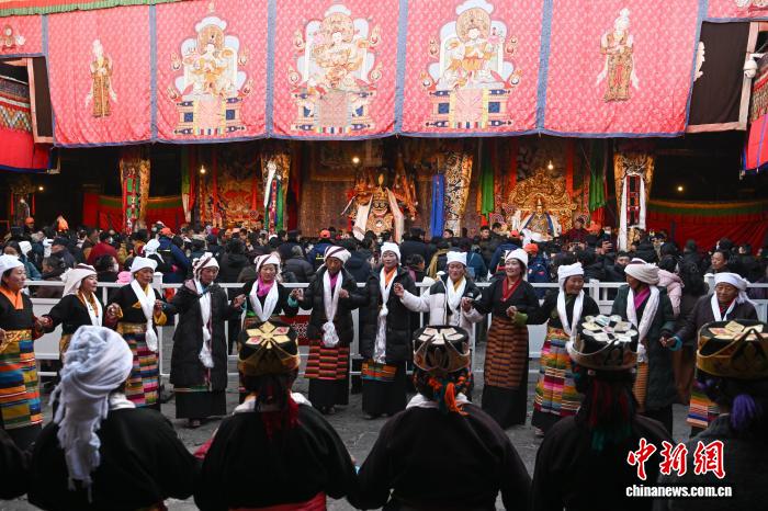 图为身着民族服装的信众在大昭寺内载歌载舞。中新社记者 贡嘎来松 摄