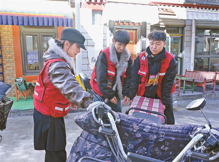 图为冬日里,拉萨市城关区雪社区网格员正排查安全隐患,疏通社区道路,保障群众便捷出行。记者 王敏 摄