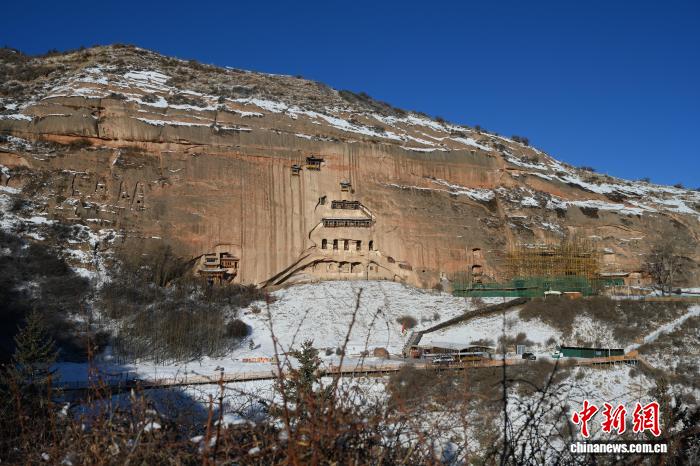 2025年12月22日,崖壁上的千年石窟在白雪映衬下更显古朴沧桑。(资料图) 戴文昌 摄