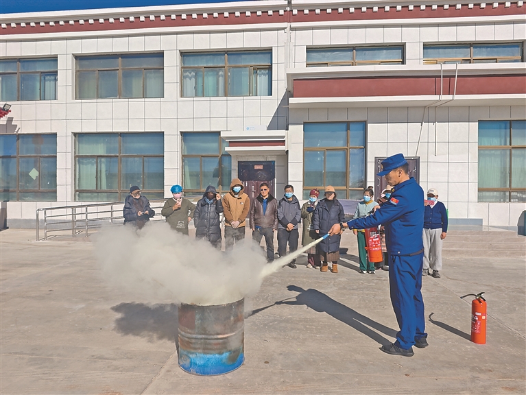 图为日喀则市仲巴县消防救援大队宣传员在辖区养老机构,开展消防安全培训和实战演练。