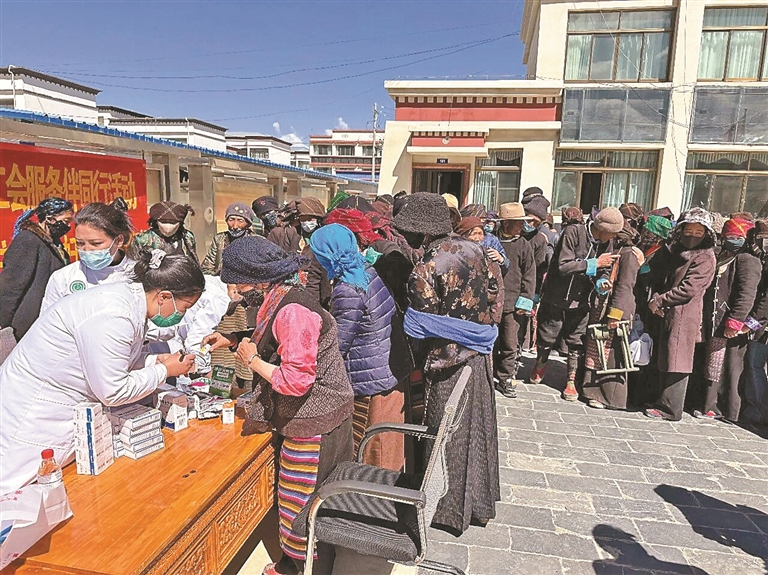 浪卡子县人民医院工作人员向多却村妇女群众发放药品。记者 巴桑旺姆 摄