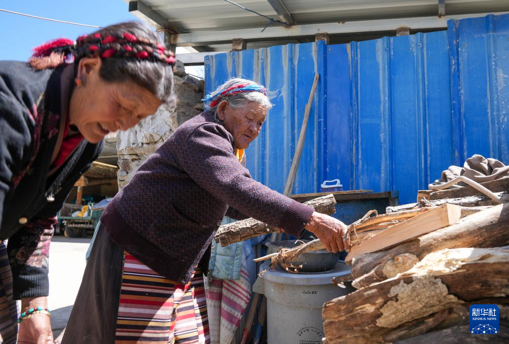次仁桑姆(右)和女儿在整理家里的木材堆(3月26日摄)。新华社记者 晋美多吉 摄