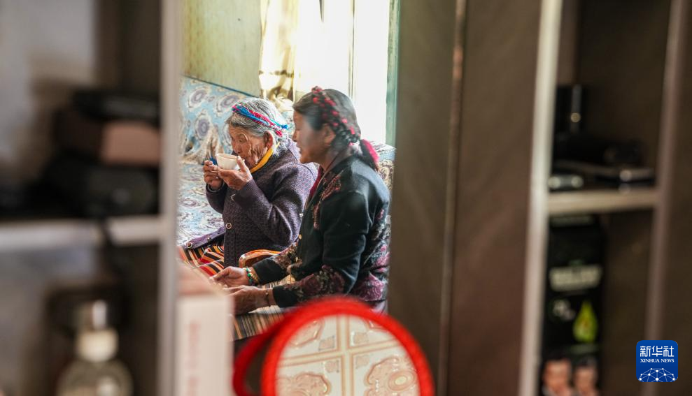 次仁桑姆(中)和两位晚辈在宗卡村家中的院子里聊天(3月26日摄)。新华社记者 丁增尼达 摄
