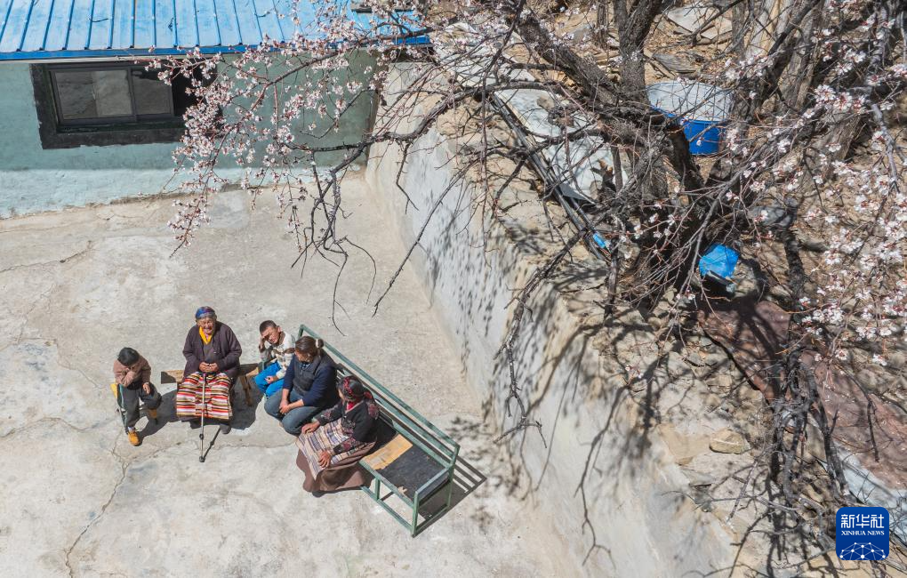 3月26日,次仁桑姆(左二)和晚辈在宗卡村家中的院子里聊天(无人机照片)。新华社记者 丁增尼达 摄