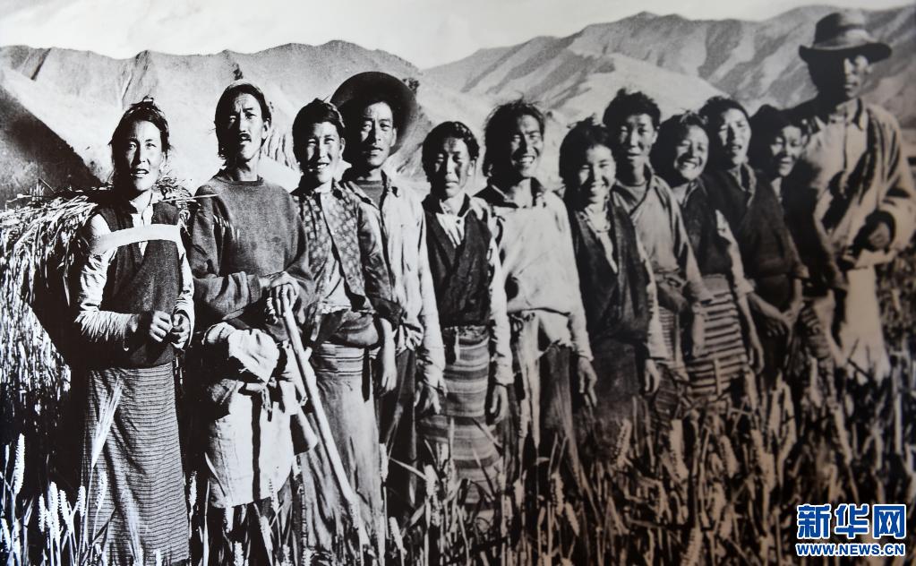 次仁拉姆(左一)当年和互助组成员在田间合影(资料照片)。新华社发
