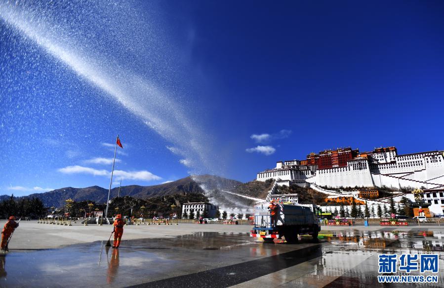 2月8日,环卫工人清洗布达拉宫广场。新华社记者 觉果 摄