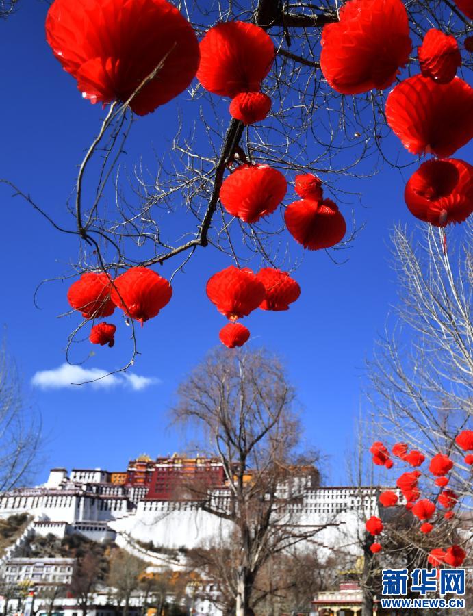 2月8日拍摄的布达拉宫前的红灯笼。新华社记者 觉果 摄