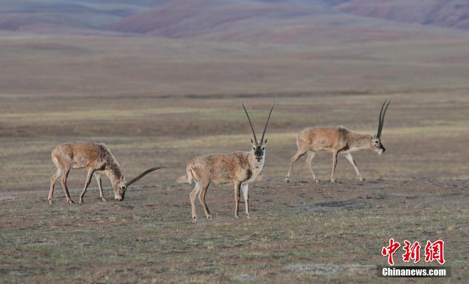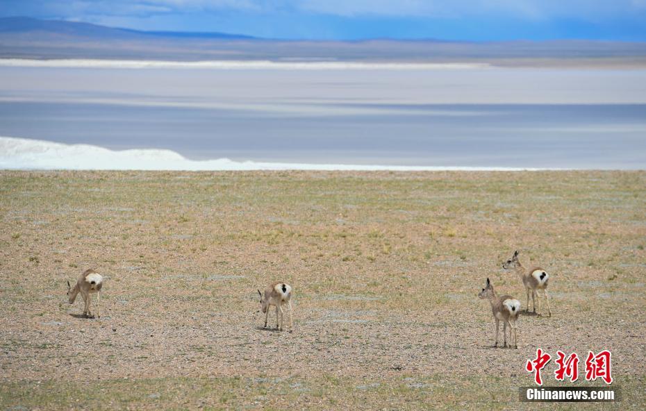 6月17日,西藏那曲羌塘草原上的藏羚羊。羌塘草原位于西藏自治区北部,平均海拔超过4600米,是目前中国海拔最高、面积最大的自然保护区。这里是野生动物的乐园,藏羚羊、藏原羚、藏野驴等珍稀野生动物与雪山、草地、蓝天、白云,构成撼人心魄的壮美画面。 中新社记者 贡嘎来松 摄
