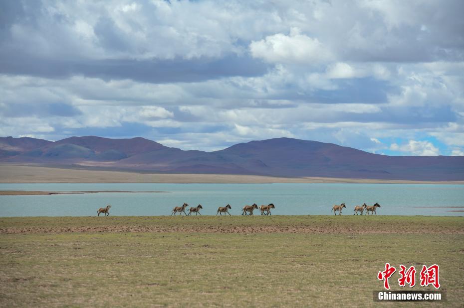 6月19日,西藏那曲羌塘草原上的藏野驴在湖边奔腾跳跃。羌塘草原位于西藏自治区北部,平均海拔超过4600米,是目前中国海拔最高、面积最大的自然保护区。这里是野生动物的乐园,藏羚羊、藏原羚、藏野驴等珍稀野生动物与雪山、草地、蓝天、白云,构成撼人心魄的壮美画面。 中新社记者 贡嘎来松 摄