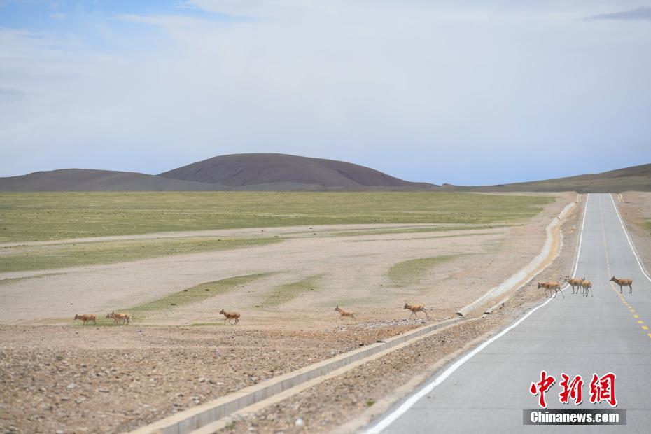 6月20日,藏羚羊群在西藏那曲双湖县境内穿越公路。羌塘草原位于西藏自治区北部,平均海拔超过4600米,是目前中国海拔最高、面积最大的自然保护区。这里是野生动物的乐园,藏羚羊、藏原羚、藏野驴等珍稀野生动物与雪山、草地、蓝天、白云,构成撼人心魄的壮美画面。中新社记者 贡嘎来松 摄