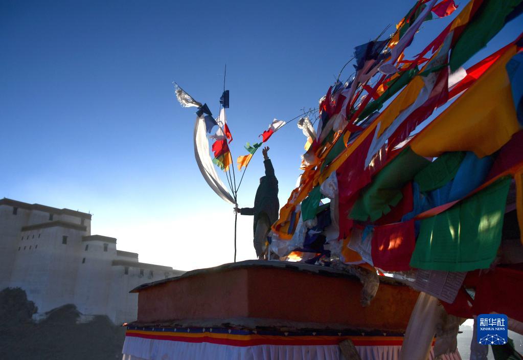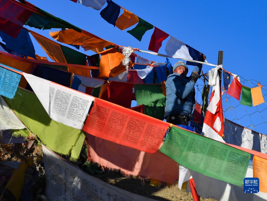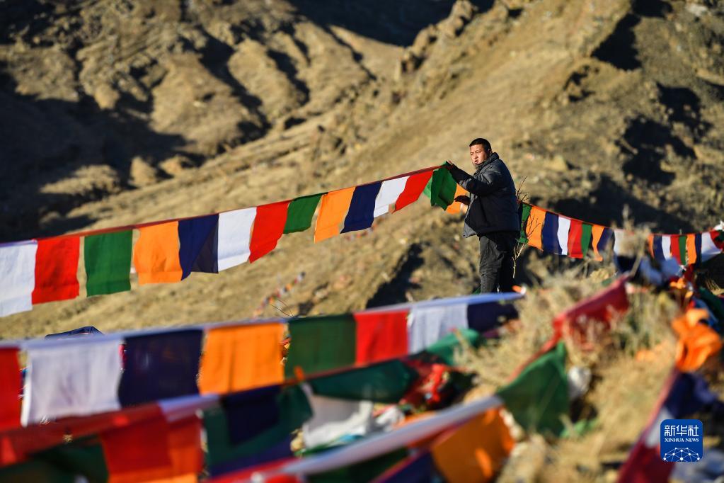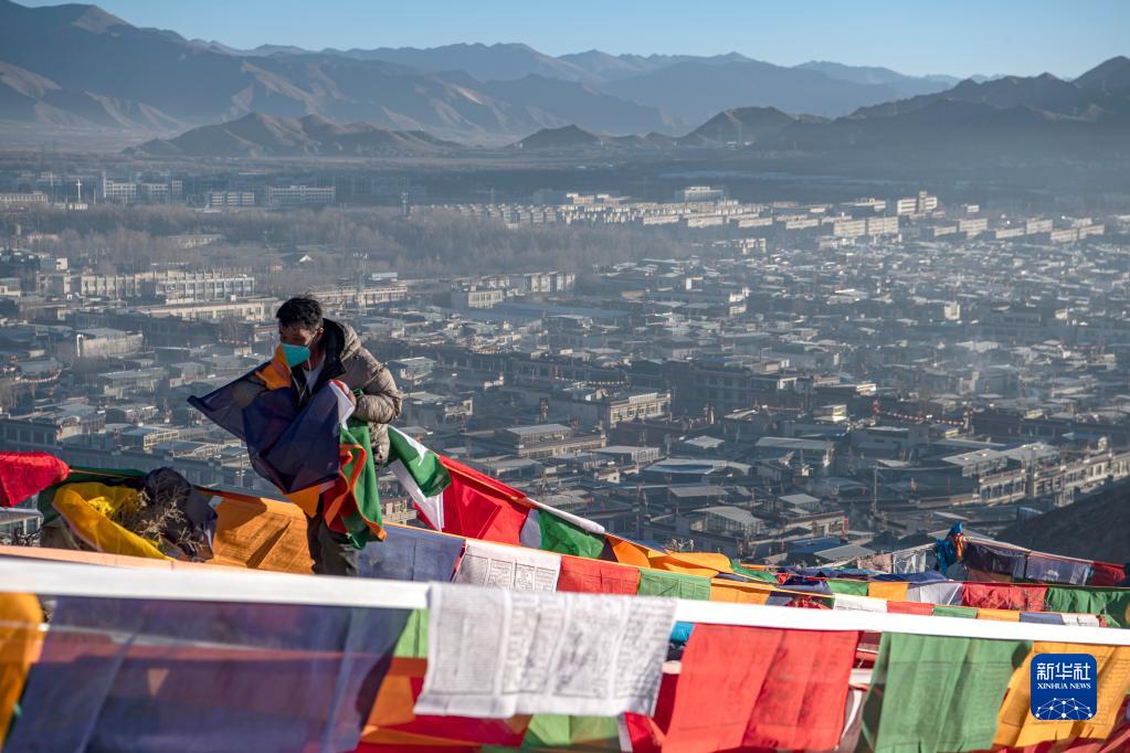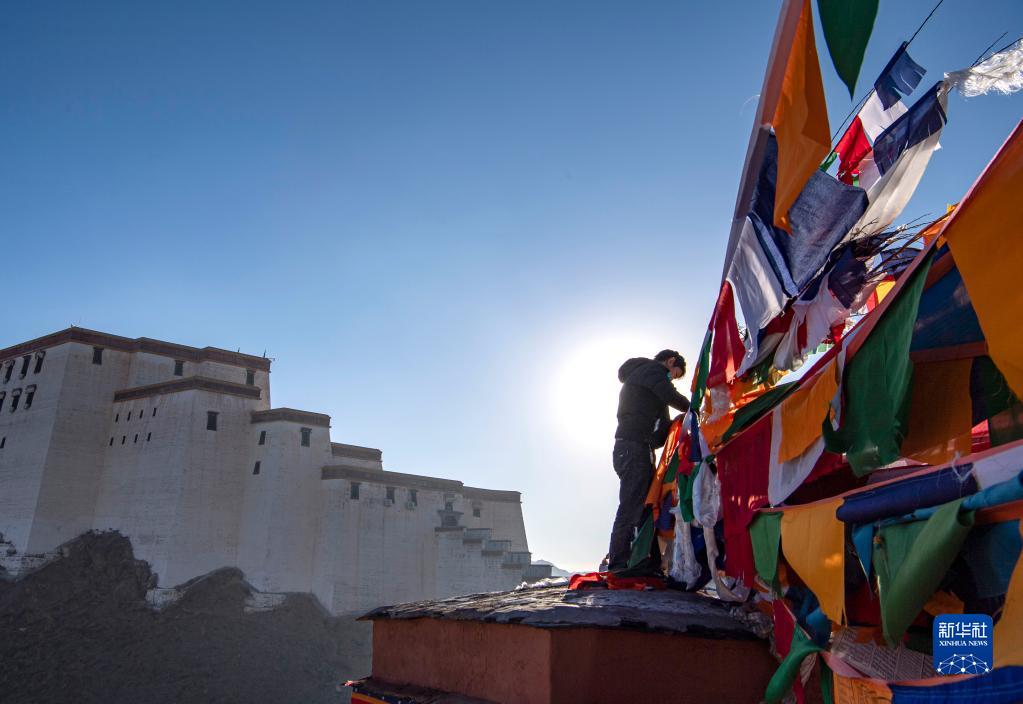 1月24日,日喀则市桑珠孜区的藏族群众在悬挂五彩经幡。新华社记者 孙非 摄