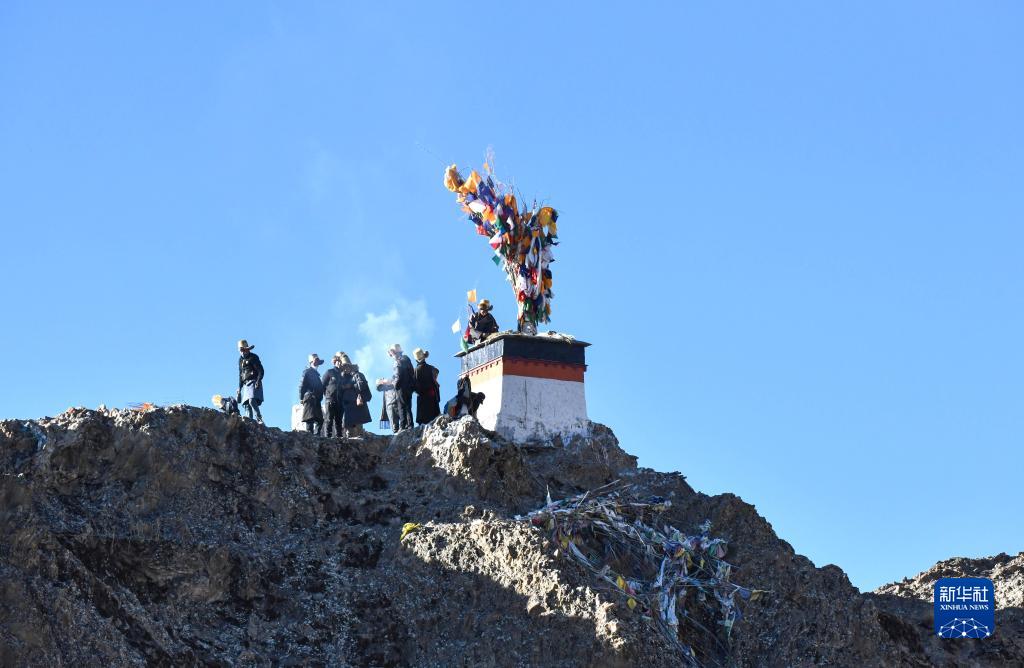 1月24日,日喀则市桑珠孜区的藏族群众在山上悬挂五彩经幡。新华社记者 孙非 摄