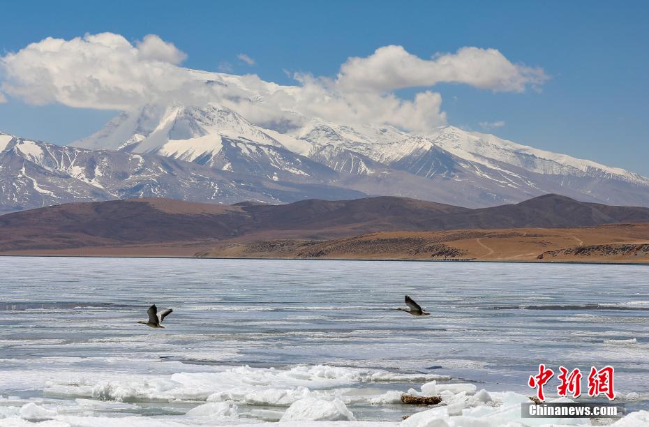 玛旁雍错冰雪消融,飞鸟水上嬉戏。