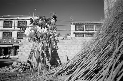 经幡树是将五彩经幡缝在树枝上,过藏历新年时,当地家庭会把经幡树插在屋顶两角,全家人着上盛装祈求在新的一年里五谷丰登、吉祥如意、福运亨通。因此这也是当地居民必备的特色“年货”。