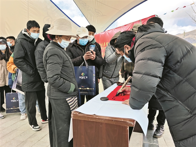 活动现场,拉萨市文联10名藏汉书法家挥舞着手中蘸满清香浓墨的毛笔,一笔一画,或遒劲有力,或行云流水,将真诚的祝福赋诸笔端,笔尖上尽显年味浓浓、情意浓浓。热情的村民、干部职工早已在书法家桌前排起了长队,准备向书法家求字纳福。有的群众根据新年心愿从写好的春联中精心挑选带回家,有的群众自选春联内容请书法家们现场为其创作。“扎西德勒”“万事如意”,书法家们热情高涨、展纸伏案,不多时,一张张满载着书法家们真挚祝福的春联便送到现场群众手上。