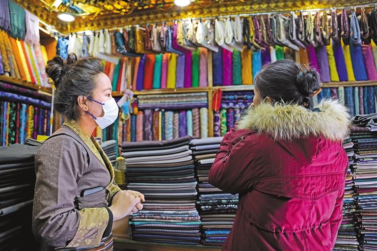 图为某藏式服装店内,顾客精心挑选布料。记者 阿旺尼玛 摄