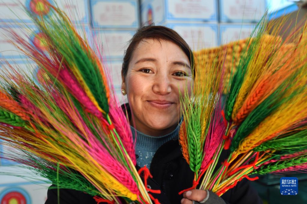 藏族姑娘索曲在展示出售的象征丰收的五彩麦穗(2月12日摄)。新华社记者 觉果 摄