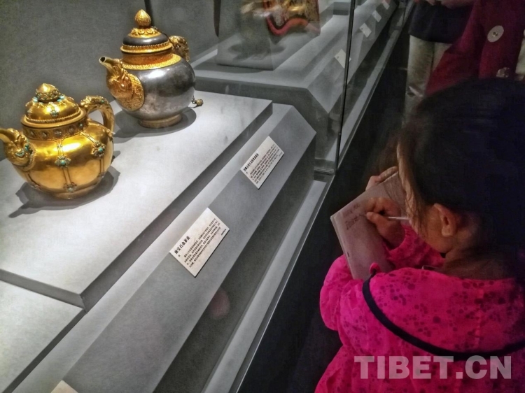 图为一个小女孩在《天路文华—西藏历史文化展》展品前做笔记 摄影:李元梅