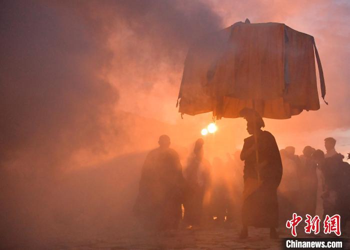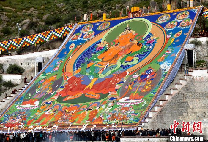 8月16日,拉萨哲蚌寺举行展佛活动。中新社记者 李林 摄