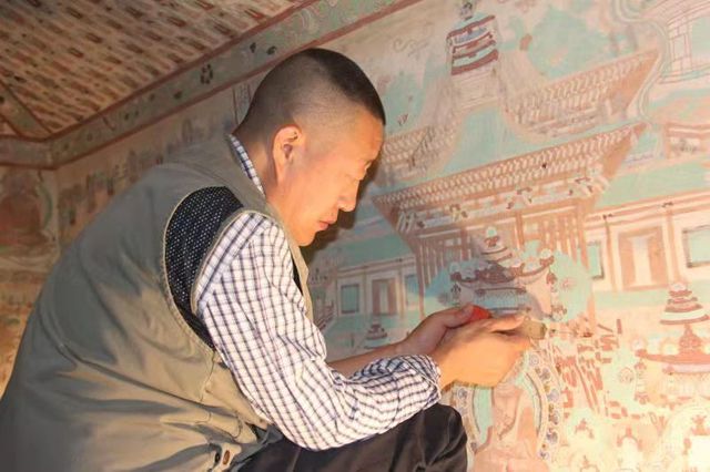 1990年,李云鹤的儿子李波同样成为了敦煌研究院的文物修复师。对于生于敦煌、长于敦煌的李波而言,回到敦煌修壁画是一件再自然不过的事情,“家里有一位修壁画的父亲,这对我的影响是极大的。而且这里是我的故乡,我对敦煌对莫高窟,有感情也有责任。”
