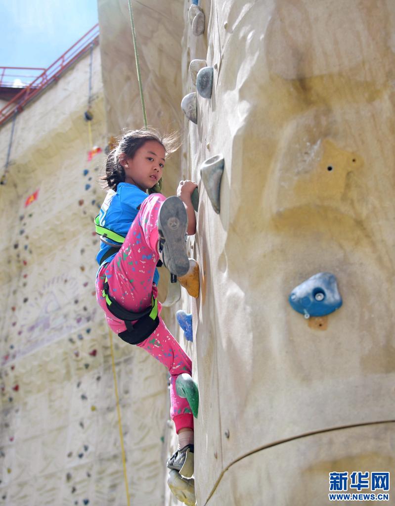 2017年5月,全运会群众性项目西藏攀岩资格赛在拉萨举行,图为少年组小选手丹乔央宗在攀爬。新华社记者 晋美多吉 摄