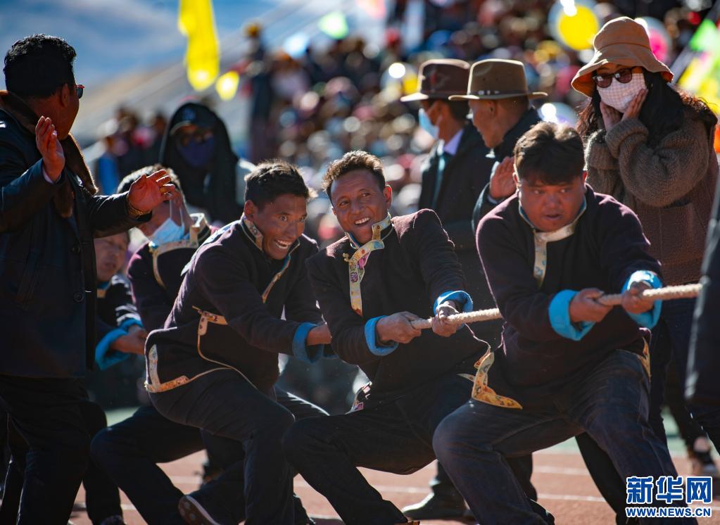 图为2020年11月29日,山南市扎囊县的农牧民在该县首届农民运动会中参加拔河比赛,在农闲期间参与全民健身的现场。新华社记者 普布扎西 摄