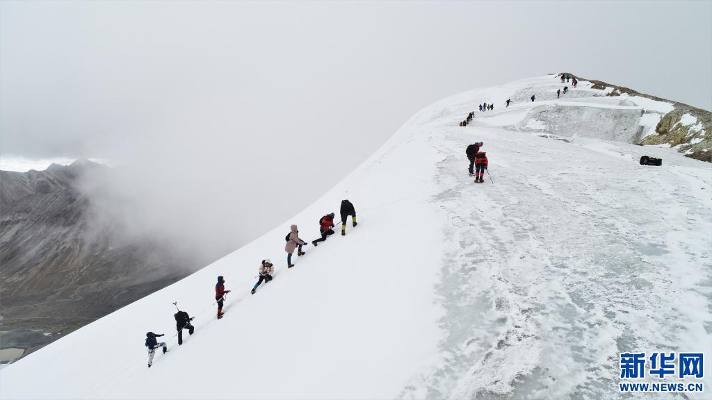 2020年10月5日,第十八届“第三极”中国西藏登山大会上登山爱好者在向洛堆峰峰顶进发(无人机拍摄)新华社记者 孙非 摄
