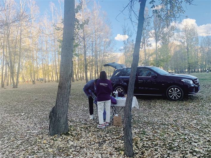 一直往树林深处走,还能看到不少私家车零零散散的停放在空地上,三五人在林间搭起帐篷、拿出音响、泡上热茶,偶尔能听到他们的嬉笑声、低语声,也有人选择骑一匹白马,远离人群,悠悠地往树林深处走去,用自己的方式享受着无忧的时光。