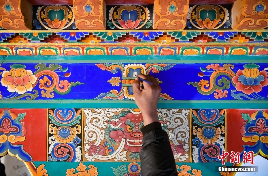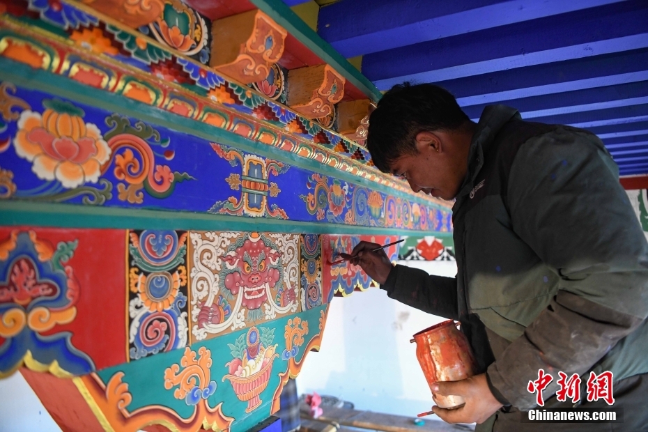 12月28日,西藏拉萨堆龙德庆区,古俗民族传统手工艺发展专业合作社员工在房屋上绘制藏式装饰。据悉,该合作社以绘画、木工、缝纫为主,承接传统手工艺方式制作家具、房子装修、唐卡绘画、旅游产品、文物建筑维修等工作。自2018年合作社成立至今,带动就业共60余人。 中新社记者 贡嘎来松 摄