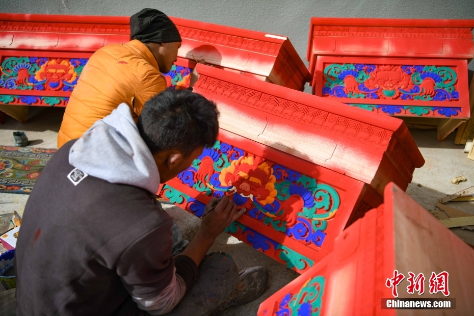 12月28日,西藏拉萨堆龙德庆区,古俗民族传统手工艺发展专业合作社员工在家具上绘制藏式装饰。中新社记者 贡嘎来松 摄