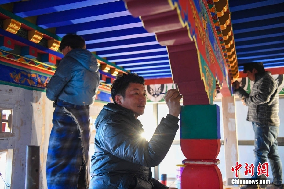12月28日,西藏拉萨堆龙德庆区,古俗民族传统手工艺发展专业合作社员工在房屋上绘制藏式装饰。中新社记者 贡嘎来松 摄